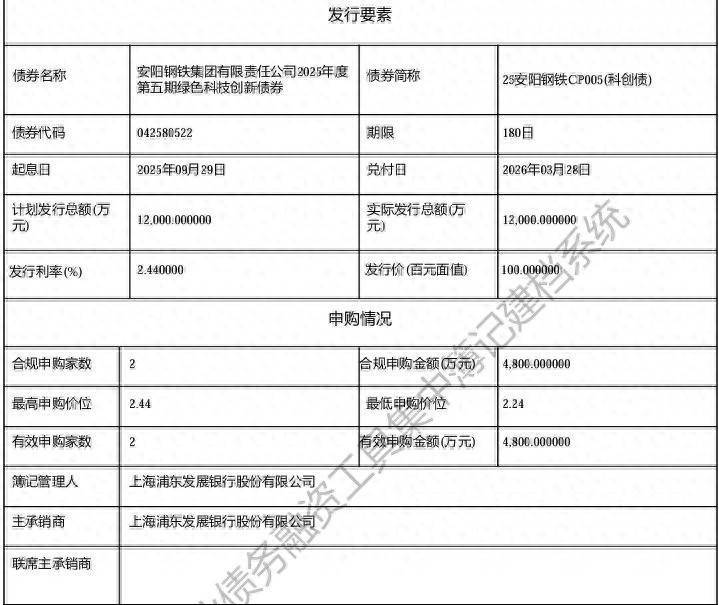 【大河财立方消息】9月30日,安阳钢铁集团有限责任公司披露2025年度第五期绿色科技创新债券发行情况。安阳钢铁集团1.2亿元绿色科技创新债完成发行,发行利率2.44%,期限180日。其中,7101.88万元用于置换3个月以内偿还募投项目贷款的自有资金支出,4898.12万元用于偿还募投项目前期借款。