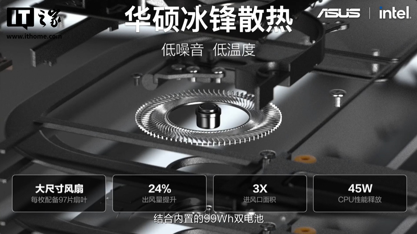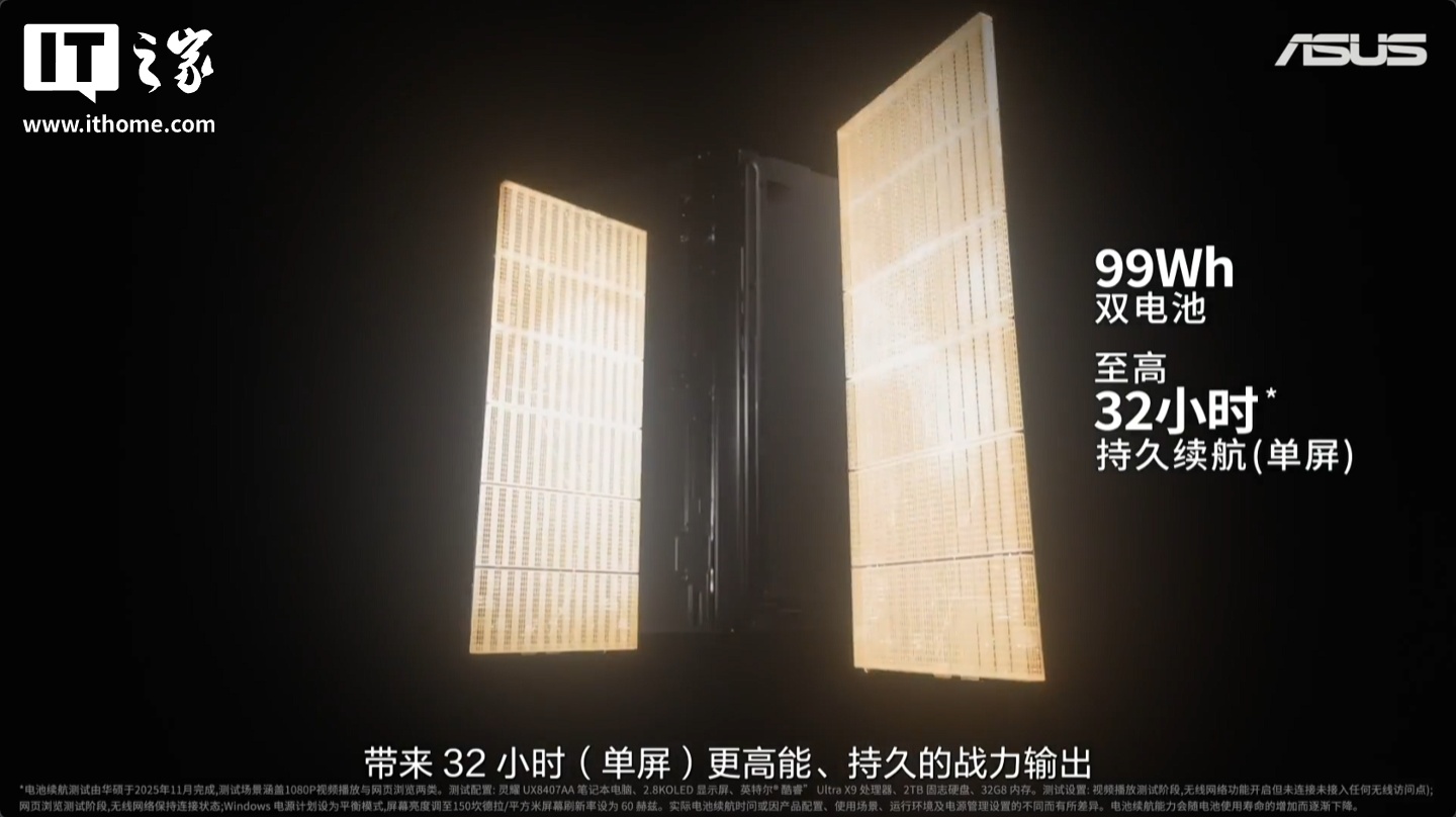 同时,这款笔记本还带有冰峰散热系统,搭载大尺寸风扇,进风口面积提升 3 倍,CPU 性能释放可达 45W,拥有 99Wh 双电池,单屏续航至高可达 32 小时。