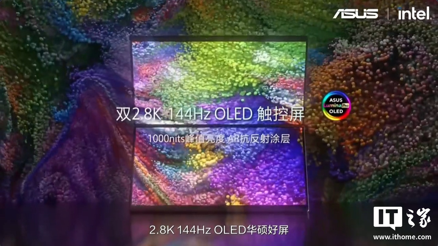 IT之家了解到,这款笔记本搭载两块 2.8K 144Hz OLED 触控屏幕,峰值亮度可达 1000 尼特,采用 AR 抗反射涂层,反光环境下观感更好,覆盖 100% DCI-P3 色域,兼容 10bit 色深,还可配合手写笔进行批注、绘画等。