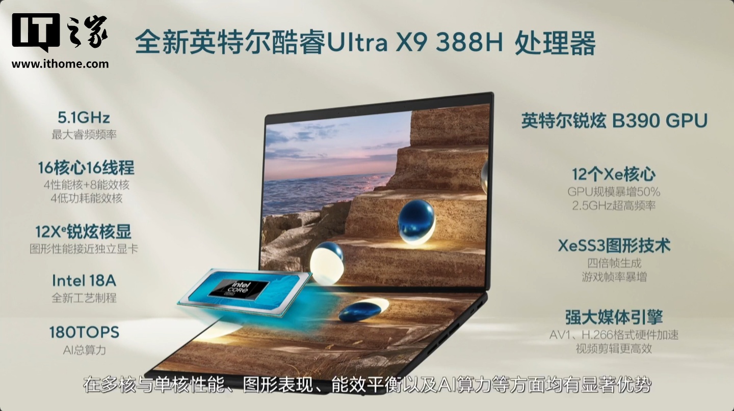参数方面,这款笔记本搭载英特尔酷睿 Ultra X9 388H 处理器,采用全新 18A 制程工艺打造,采用 16 核心、16 线程设计,最大睿频频率可达 5.1GHz,具备锐炫 B390 GPU,带有 12 个 Xe 核心,频率可达 2.5GHz,支持 XeSS3 图形技术,还可硬解 AV1、H.266 等视频格式,助力创作者高效剪辑。